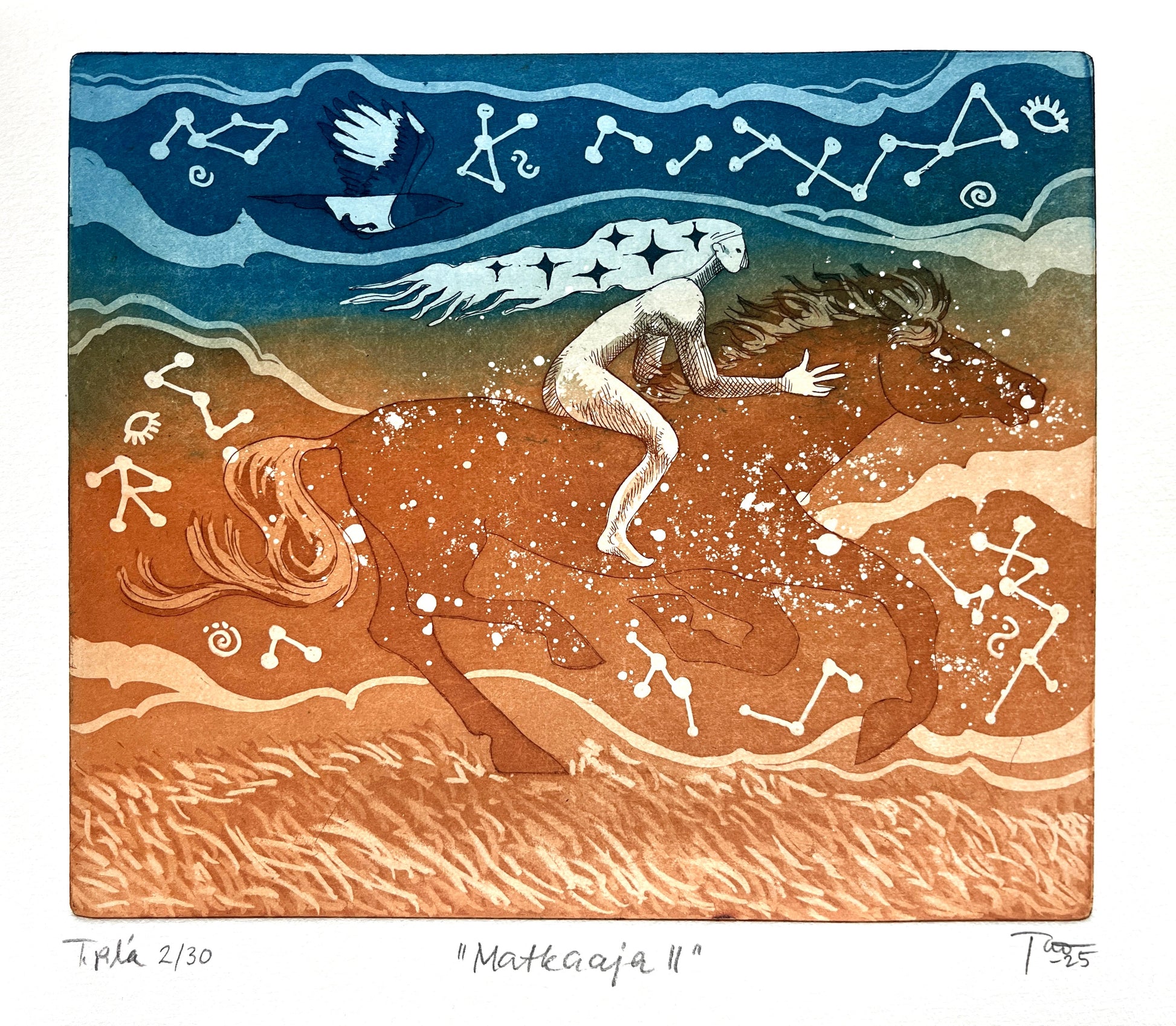 Etsaus ja akvatinta kuparille, joka on vedostettu luonnonvalkoiselle Hahnemühle -syväpainopaperille. Laatan valmistusmivuosi on 2025. Kuva-alan koko on 17.5 x 21.9 cm ja paperin koko on 26 x 24.5 cm.