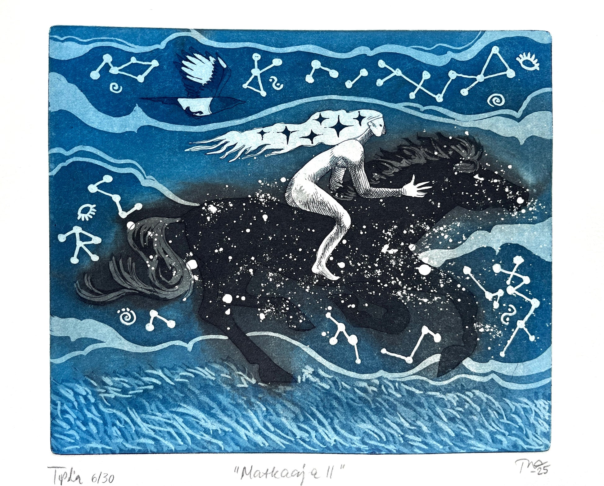 Etsaus ja akvatinta kuparille, joka on vedostettu luonnonvalkoiselle Hahnemühle -syväpainopaperille. Laatan valmistusmivuosi on 2025. Kuva-alan koko on 17.5 x 21.9 cm ja paperin koko on 26.5 x 25.5 cm.
