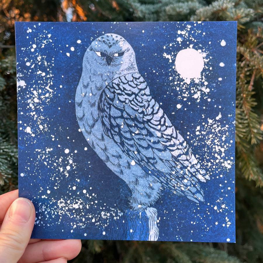 Pöllö kuuntelee hangen rapinaa sydäntalven yönä.