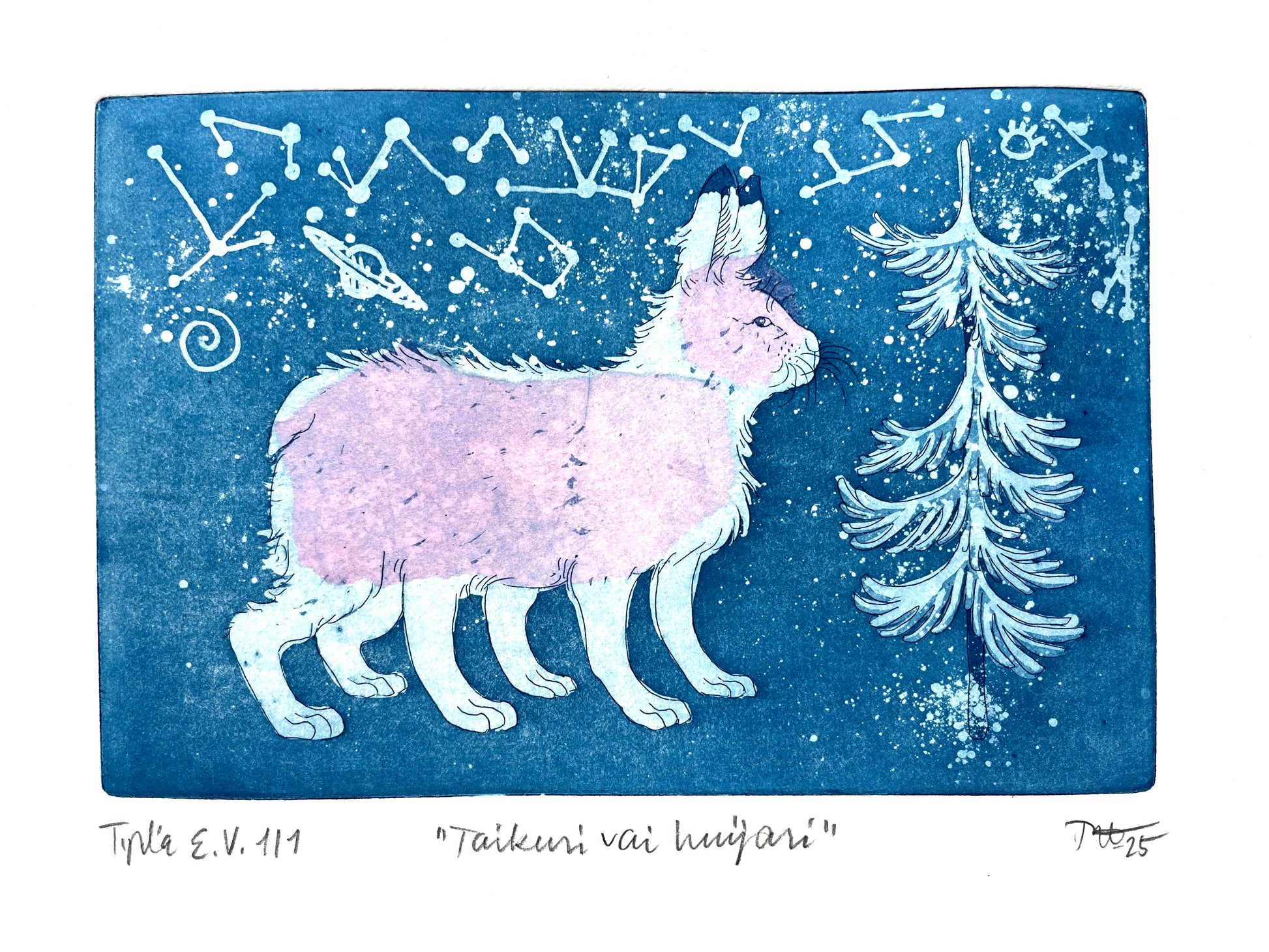 Etsaus ja akvatinta kuparilaatalle, jonka koko on 12.3 x 18.7 cm. Vedos on tehty luonnonvalkoiselle 300g Hahnemühle -syväpainopaperille. Paperin koko on 19.5 x 27 cm.