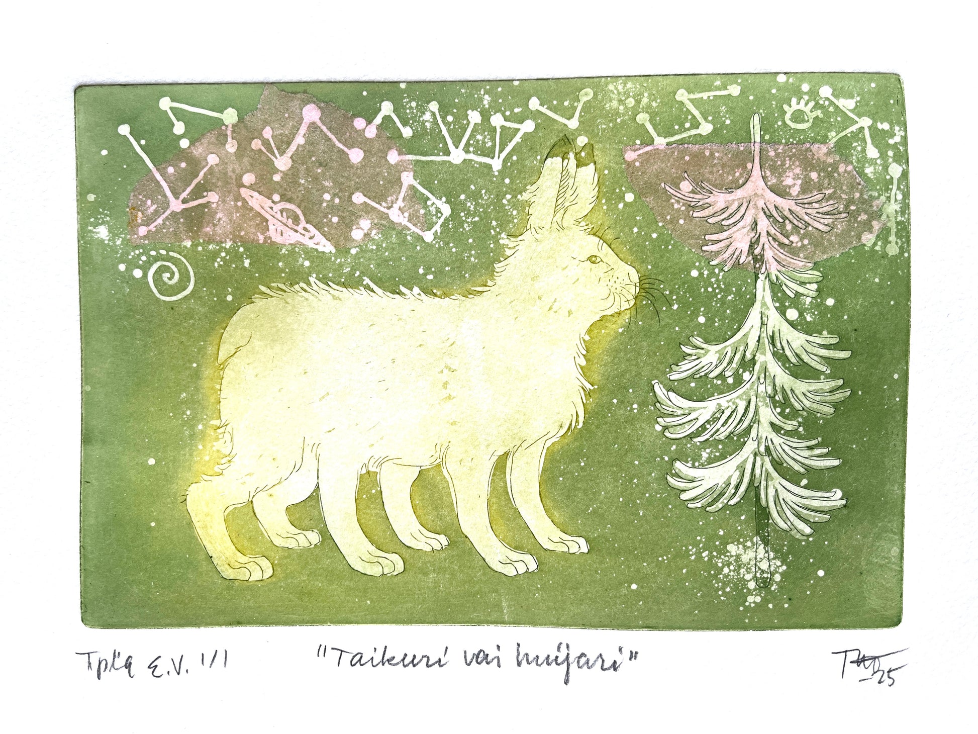 Etsaus ja akvatinta kuparilaatalle, jonka koko on 12.3 x 18.7 cm. Vedos on tehty luonnonvalkoiselle 300g Hahnemühle -syväpainopaperille. Paperin koko on 19 x 27 cm.