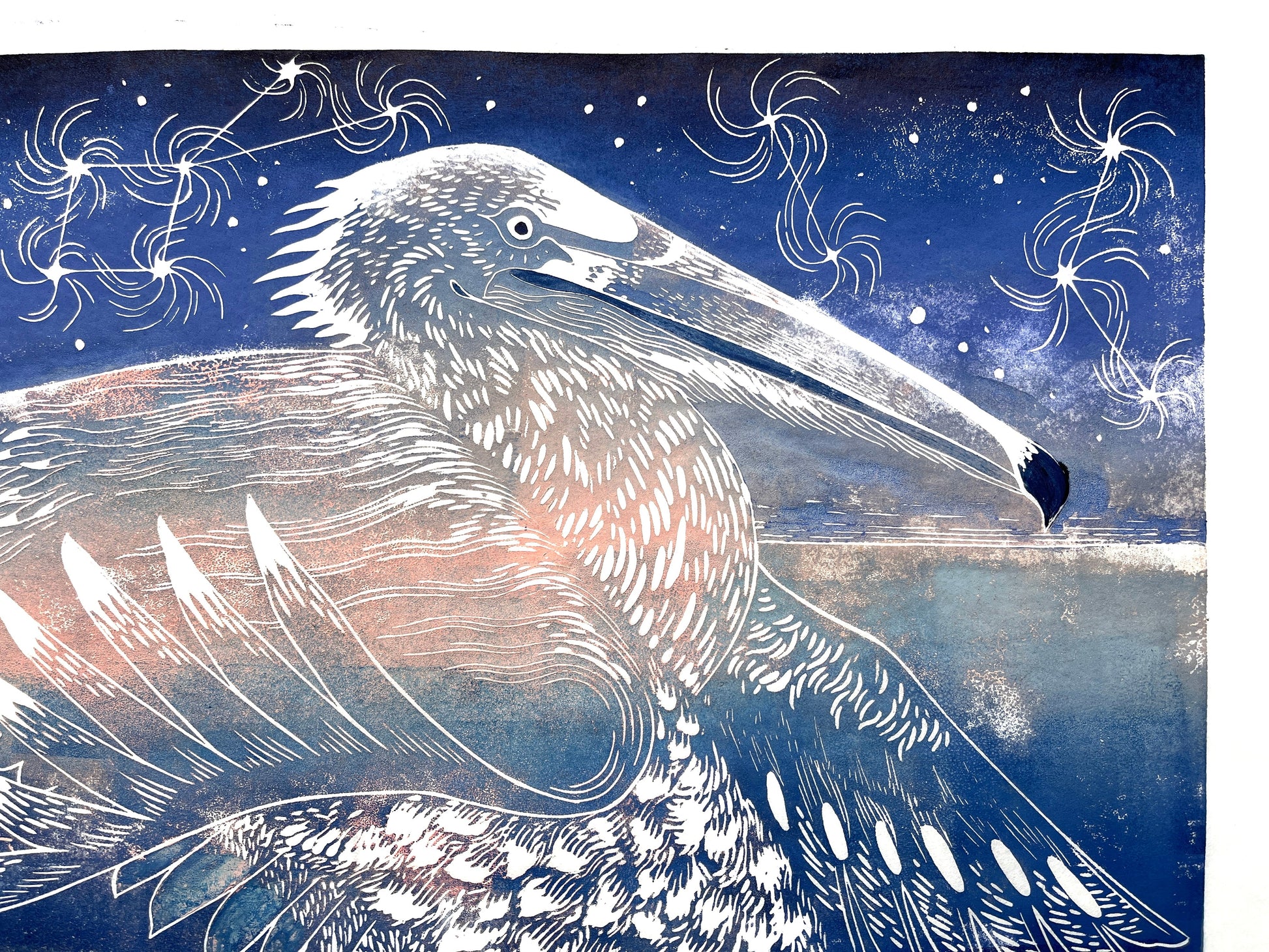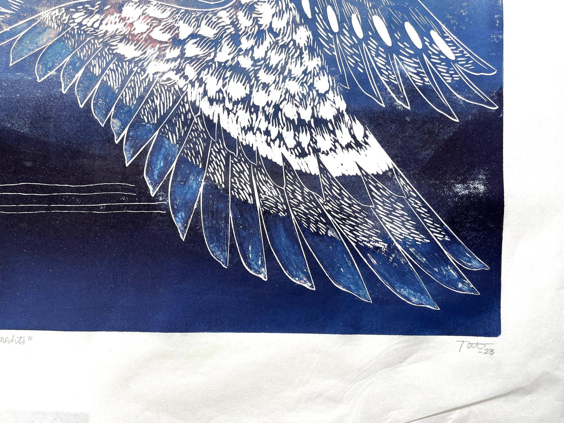 Linopiirroksen kuva-alan koko on 42 x 60.4 cm ja se on painettu japaninpaperille. Paperin koko on 49 x 69 cm.